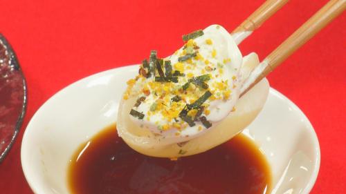 1)「アイス大福」を4等分にする 2)「ふりかけ」をかける 3)「しょうゆ」をつける